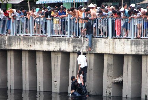 Rất may, một thanh niên sửa xe gần đó đã nhanh chóng nhảy xuống, bơi đến cứu cô gái (lúc này đang rất hoảng loạn). Dù tiếp cận được cô gái, nhưng do dòng nước chảy xiết và không có lối đi lên, nên người này rất vất vả để dìu cô gái lần theo bờ kè dựng đứng. Khoảng 10 phút sau, khi cả hai trôi khoảng 200 mét thì người dân đã dùng thang dây đưa cô gái lên. Lúc lên bờ, cô gái đã ngất đi nhưng vẫn còn thoi thóp thở, liền được đưa lên xe taxi vào bệnh viện cấp cứu.
