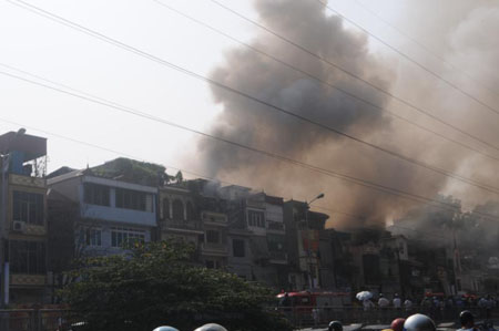 (10:56:04 AM 26/08/2012)Một số người dân chứng kiến vụ việc cho biết, ngọn lửa xuất phát từ căn nhà gỗ ở dãy nhà tập thể phố Hồng Hà. Ngay sau đó, ngọn lửa nhanh chóng lan ra những ngôi nhà xung quanh. Khói đen bốc lên mù mịt.