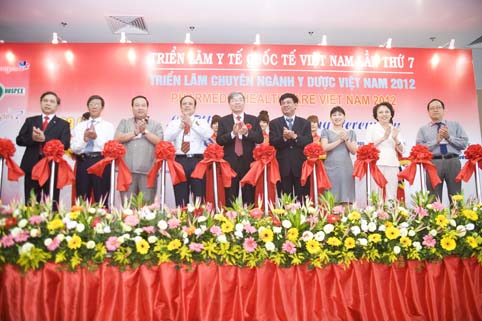 Các đại biểu cắt băng khai mạc Triển lãm Y tế Quốc tế Việt nam lần thứ 7 sáng 26/9/2012