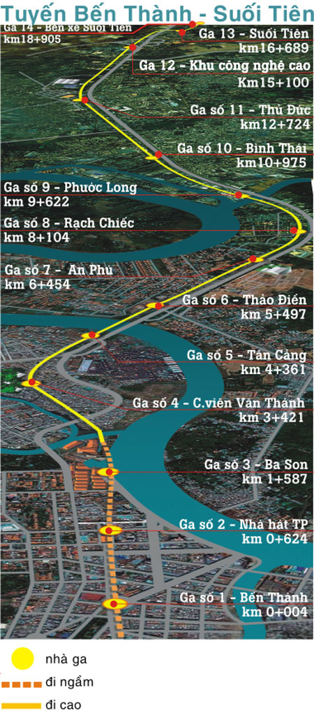 Đoạn đi cao dài 17,1 km, có 11 nhà ga: tuyến vượt đường Nguyễn Hữu Cảnh đi theo rạch Văn Thánh (bờ phía Bắc), đi sát công viên Văn Thánh, vượt đường Điện Biên Phủ, vượt sông Sài Gòn tại khu vực nhà hàng Tân Cảng (cách 40 m về phía thượng lưu so với cầu Sài Gòn hiện hữu); sau đó đi tiếp trong hành lang phía Bắc xa lộ Hà Nội vượt sông Rạch Chiếc (về phía thượng lưu so với cầu Rạch Chiếc hiện hữu); tiếp tục đi theo hành lang xe điện nằm trong hành lang phía Bắc thuộc lộ giới xa lộ Hà Nội. Đến khoảng Km 18 535 tuyến vượt sang phía Nam xa lộ Hà Nội để vào ga số 14 (ga Bến xe Suối Tiên - Km 18 905).