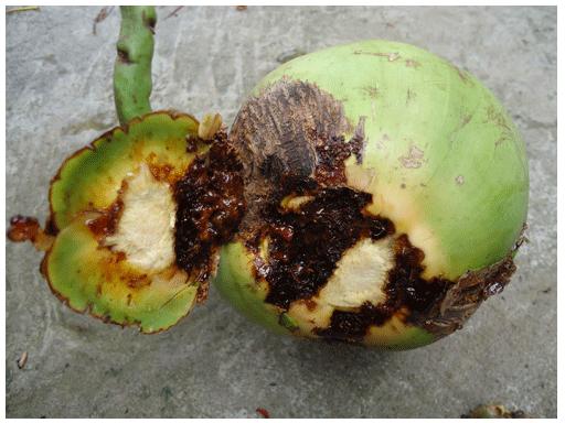 Theo Chi cục Bảo vệ thực vật tỉnh Kiên Giang, bọ vòi voi thuộc bộ cánh cứng, họ vòi voi. Ở nước ta, loài côn trùng này hầu như chưa có tài liệu nào nghiên cứu về chúng. Bọ vòi voi tấn công gây hại trên trái dừa rất sớm, làm trái dừa xuất hiện những vết sẹo, vết nứt có chất nhựa dẻo màu nâu đỏ chảy ra. Bọ vòi voi gây hại trái dừa lúc còn non (dưới 3 tháng tuổi) sẽ làm trái rụng sớm; nếu chúng gây hại trái dừa từ 3 tháng tuổi trở lên thì trái không rụng, nhưng kém phát triển, hình dạng méo mó, kích thước nhỏ… làm giảm năng suất và giá trị thương phẩm của trái dừa.