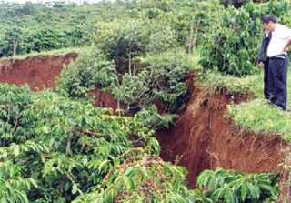 Toàn bộ khu vực sụt lún khoảng 5.000 m2 đất trồng cà phê 7 năm tuổi của gia đình bà Nguyễn Thị Tiềm. Bà Tiềm cho biết, ban đầu chỉ là những vết nứt nhỏ, nhưng sau đó vết nứt cứ lớn dần như hiện nay. Hằng ngày, gia đình bà vẫn ở nhà và vào khu vực sụt lún để hái cà phê, nhưng những hôm mưa to thì phải đi ở nhờ nơi khác và cũng không vào khu vực canh tác.