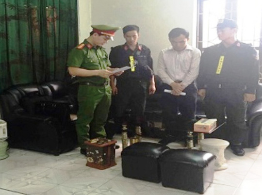 Công an đang đọc lệnh khởi tố ông Hoàng Mạnh Thường (áo trắng), Giám đốc Đài khí tượng thủy văn tỉnh Hà Nam - Ảnh: Công an Hà Nam