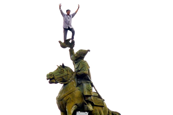 | Người đàn ông đứng huơ tay trên đỉnh tượng đài. Ảnh: Lê Giang |
