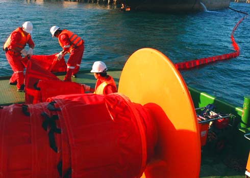Dùng phao vây ngăn chặn sự cố tràn dầu ở cảng Dung Quất.