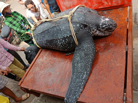 Rùa da nặng 200 kg được ngư dân bàn giao Ban quản lý khu bảo tồn biển Phú Quốc. -ẢNH: BẢO TỒN BIỂN PHÚ QUỐC CUNG CẤP.