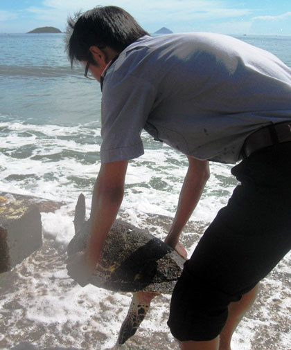 (10:47:11 AM 09/11/2011)(Tin Môi Trường) - (Tinmoitruong.vn) - Ngày 8/11, tại vùng biển Hòn Một, phường Vĩnh Hòa, TP Nha Trang, doanh nghiệp tư nhân Phước Thọ phối hợp với Chi cục Khai thác và bảo vệ nguồn lợi thủy sản Khánh Hòa đã thả hai con đồi mồi quý về biển.