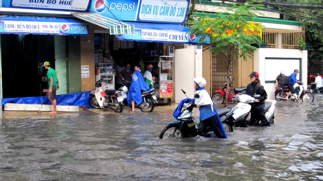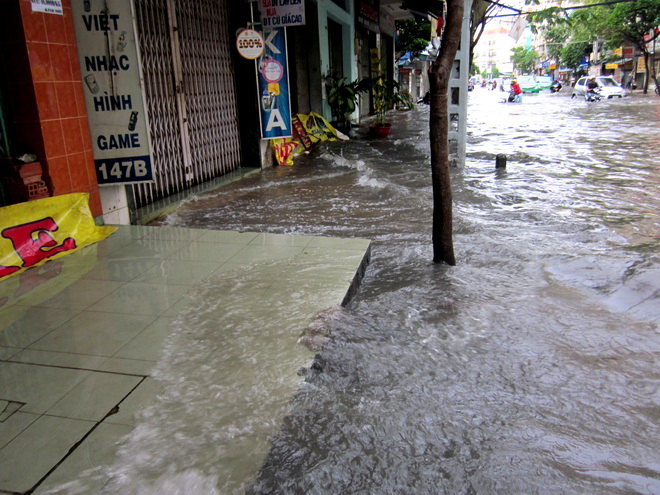 (15:00:33 PM 01/10/2012)Trên đường Đồng Đen, Âu Cơ (quận Tân Bình), Kinh Dương Vương (quận 6)… nước dâng cao khiến xe cộ qua lại gặp nhiều khó khăn. Nhiều hộ buôn bán hai bên đường không thể mở cửa sớm vì nước ngập.