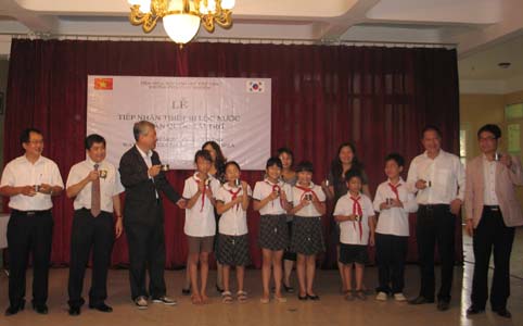 Quang cảnh trao tặng thiết bị lọc nước do phía Hàn Quốc tài trợ cho Trường PTCS Thực nghiệm (Hà Nội)