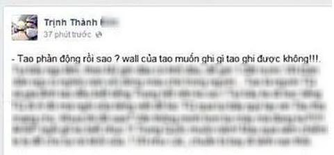 Chuyện chưa dừng lại khi mới đây, Trịnh Thành… đăng tiếp status mới cho rằng mình không đăng hai nội dung trước đó. Nhiều người cho rằng hành động này rất hèn và cũng giống như một số bạn trẻ tự tung ảnh nóng Facebook, sau đó bị phản ứng và lại nói rằng tài khoản mình bị hack.