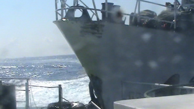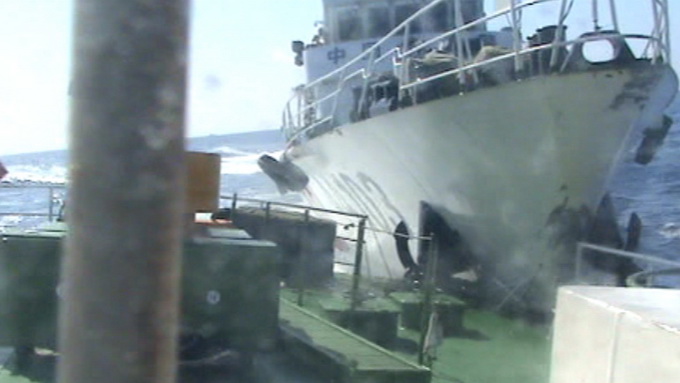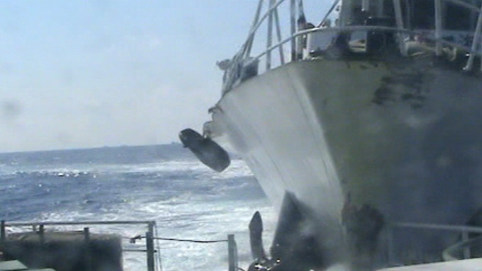 Mũi tàu Hải cảnh Trung Quốc đâm thẳng tàu Cảnh sát biển Việt Nam - Nguồn: Cảnh sát biển VN