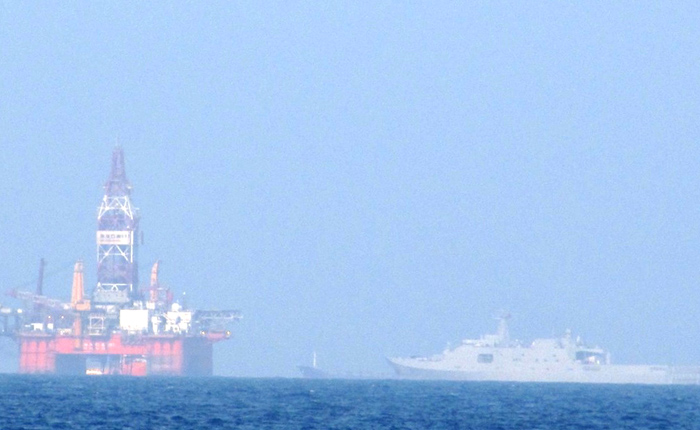 Tàu chiến của Trung Quốc (phải) lúc còn kè kè bảo vệ giàn khoan Hải Dương 981 hạ đặt trái phép trong vùng biển của Việt Nam - Ảnh: HOÀNG DŨNG