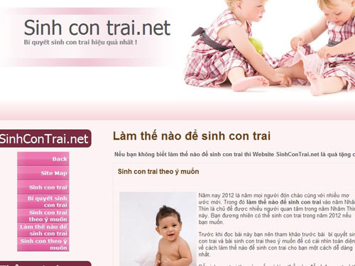 Trang www.freewebs.../sinhcontrai được giới thiệu là “cơ sở khoa học để chọn giới tính” dành hẳn một chuyên mục mang tên “cơ sở lý luận”, dù không có tên tác giả. Trang desinhcontrai.wordp… còn khẳng định “đã được chứng minh xác suất trên 98%” dù toàn bộ nội dung trang web chỉ vỏn vẹn 3 bài viết với những lời khuyên mơ hồ về tư thế quan hệ, sắp xếp thời gian quan hệ hợp lý. Trang web này còn hướng dẫn người đọc tiếp tục truy cập vào trang sinhcontraihay… .com với nội dung chủ yếu là những đường dẫn phim sex. Thậm chí một số trang web còn chỉ cách sinh con trai, con gái theo ý muốn bằng phương pháp tính tuổi cha mẹ, tính năm, tháng thụ thai và sinh nở.
