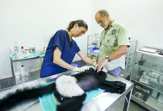 | Chuyên gia động vật học Tilo Nadler và bác sĩ thú y Ulvicke Streicher (trái) khám sức khỏe cho một con voọc đã bị gây mê. |