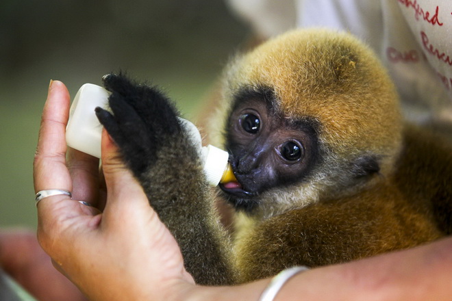 | Một chú voọc non được chuyên gia của trung tâm cho bú sữa, bố mẹ chú voọc này đã bị thợ săn bắn chết. |