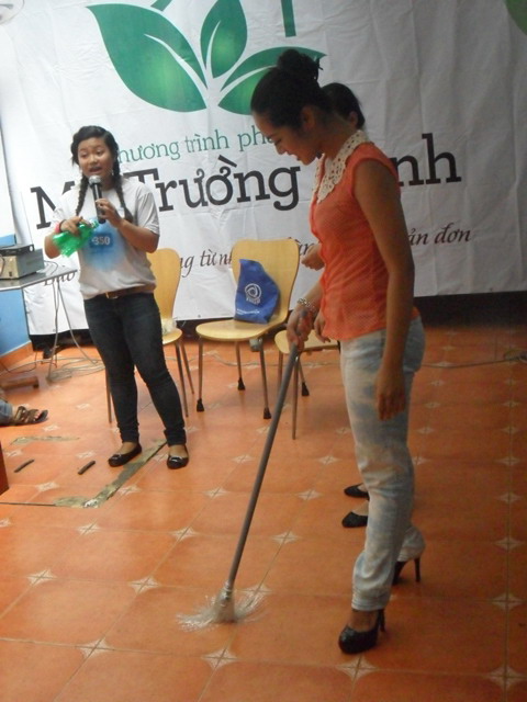 Diễn viên Thuý Nga thích thú sử dụng cây chổi làm từ chai nhựa