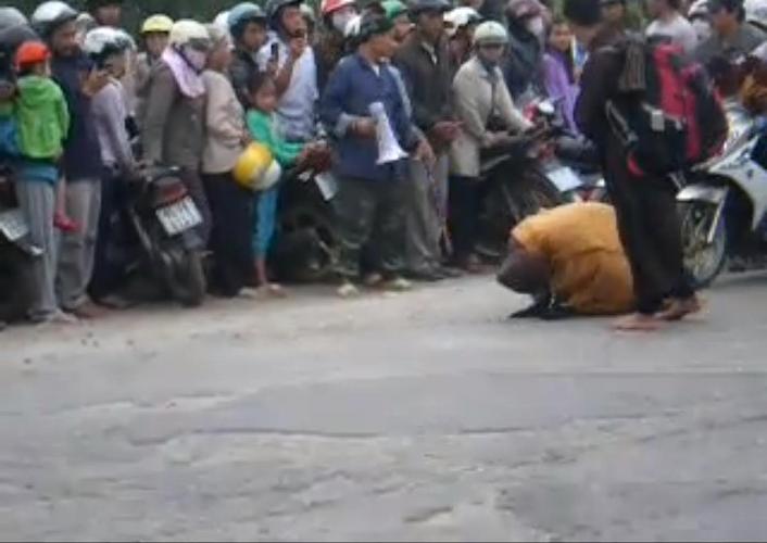 | Trước đó, khi đoàn "nhất bộ nhất bái" đến địa phận tỉnh Quảng Bình, đây cũng là nơi ghi dấu, lần đầu tiên hình ảnh các thành viên trong đoàn tháp tùng “tung chưởng”, ném nón lá vào người dân hiếu kỳ đến xem nhà sư hành lễ bị ghi lại |