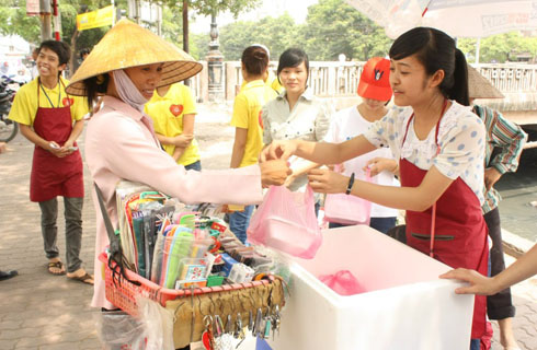 Ra đời muộn hơn một năm so với dự án tái chế, Cơm 5.000 Hà Nội của Câu lạc bộ Tình nguyện trẻ chọn kinh doanh từ thiện bằng những suất cơm giá rẻ cuối tuần. Từ tháng 9 đến nay, nhóm đã bán được 700 suất đồng đến tay những người lao động nghèo ở khu vực cầu Mai Động. Hình ảnh các bạn trẻ áo vàng, mang tạp dề với những suất cơm giá rẻ dần trở nên quen thuộc với người lao động ở đây.
