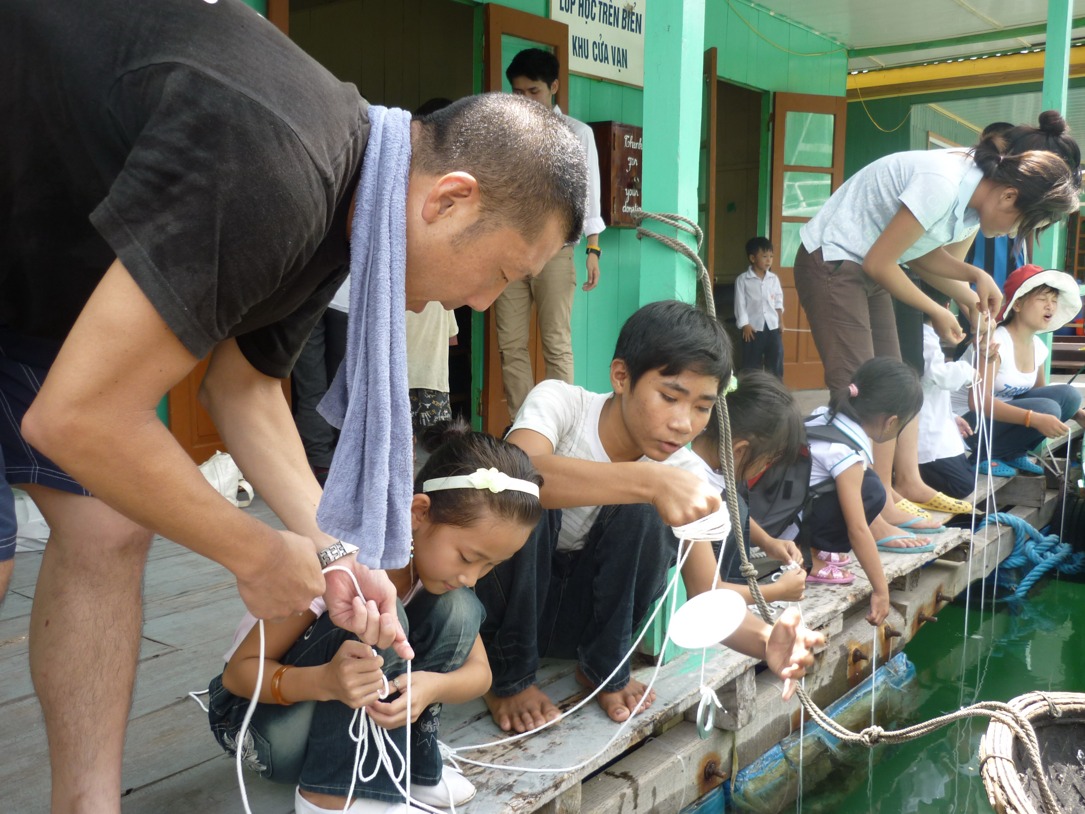 Giáo sư Otsuka cùng các em học sinh làng chài đo mực nước của Vịnh Hạ Long.
