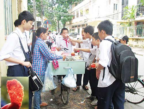 Hàng rong bán những món quà vặt hầu như không được kiểm định, kiểm tra chất lượng nhưng vẫn được nhiều học sinh tìm mua. (Ảnh chụp tại cổng Trường Tiểu học Nguyễn Huệ, Hà Đông, Hà Nội - ảnh lớn).