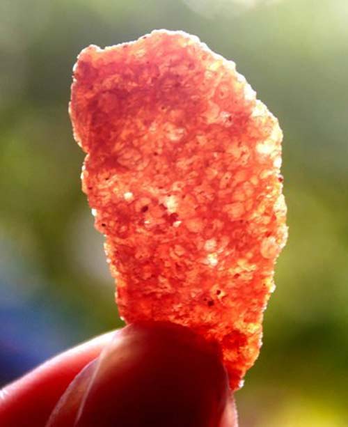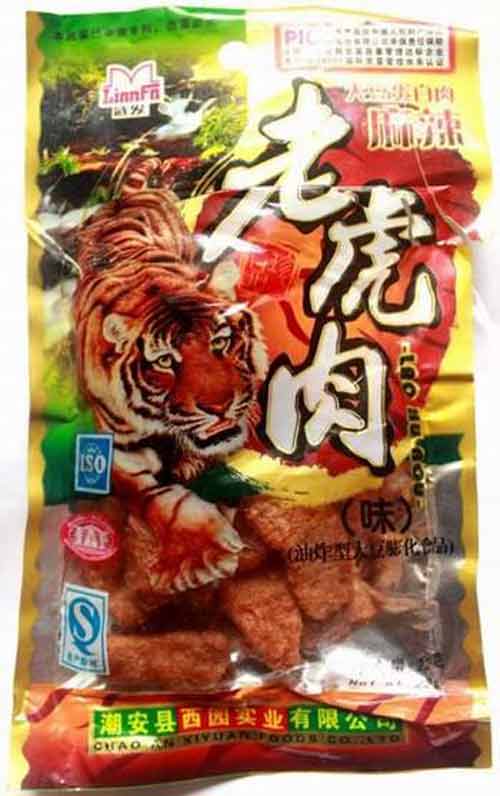 Nhận được thông tin đó, PV trực tiếp tìm đến nhà chị T. và được chị cho xem gói "thịt hổ khô" nói trên. Quan sát ban đầu thì gói "thịt hổ khô" được đóng trong túi nhựa kín, to bằng bàn tay. Màu sắc trang trí bắt mắt với biểu tượng nổi bật là hình con hổ. Ba chữ Trung Quốc in đậm trên bao bì tạm dịch là "Khô hổ thịt"... Bên trong mỗi túi có khoảng hơn chục miếng "dạng thịt" màu đỏ hồng, được thái lát nhỏ như miếng khoai tây chiên. Nhấm có vị cay cay, chua chua, ngọt ngọt, nhai thấy dai như bóng bì khô. Chị T. cho hay, sau khi phát hiện gói kẹo lạ này, chị đã cấm con không được mua nữa. Và cũng rất lo liệu loại thịt đó có ảnh hưởng gì đến sức khỏe của con mình không?