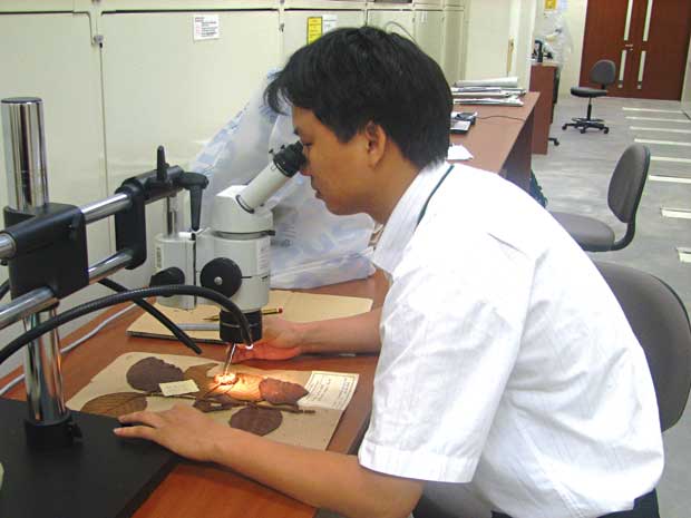 | Mặc dù có chuyên môn tốt, các chuyên gia bảo tàng Thiên nhiên Việt Nam vẫn phải làm việc trong điều kiện khá thiếu thốn. Trong ảnh là chuyên gia đang nghiên cứu thực vật trong phòng thí nghiệm bảo tàng Thiên nhiên Việt Nam. |
