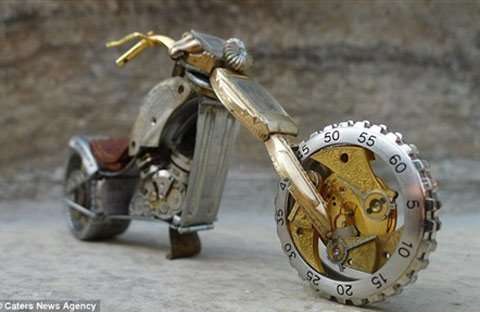 Những chiếc xe máy tý hon này dài khoảng 15 cm, cao khoảng 7 - 8 cm được lắp ghép hoàn toàn từ những chiếc đồng hồ hỏng.