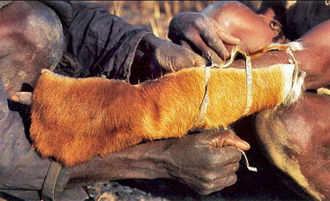 | Những người bắt trăn thuộc bộ tộc Gbaya ở Cameroon bọc tấm da thú dày vào một cánh tay.
