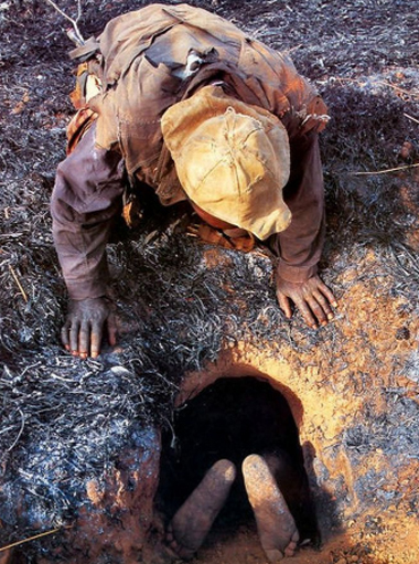 | Thợ săn đốt đuốc để quan sát trong hang của trăn.