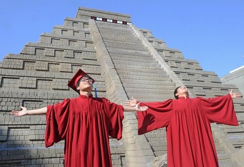 Các sinh viên tốt nghiệp chụp hình lưu niệm tại Kim tự tháp theo kiến trúc mô phỏng người Maya tại Đài Trung, Đài Loan Trung Quốc (Nguồn: AFP)